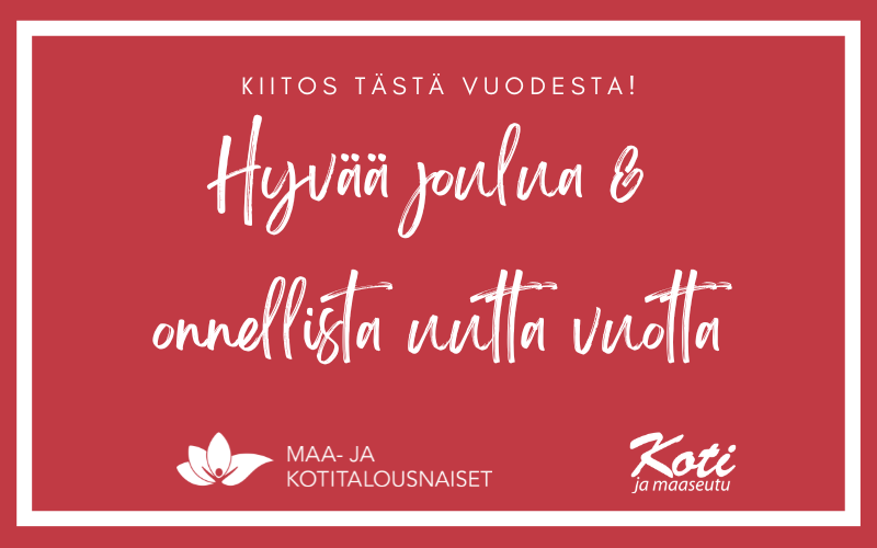 Kiitämme tästä vuodesta ja toivotamme oikein hyvää uutta vuotta. Maa- ja kotitalousnaisille tuleva vuosi on erittäin merkityksellinen, sillä järjestömme täyttää 90 vuotta. Seuraa viestintäämme ensi vuonna, niin pysyt kartalla juhlavuoden tapahtumista.