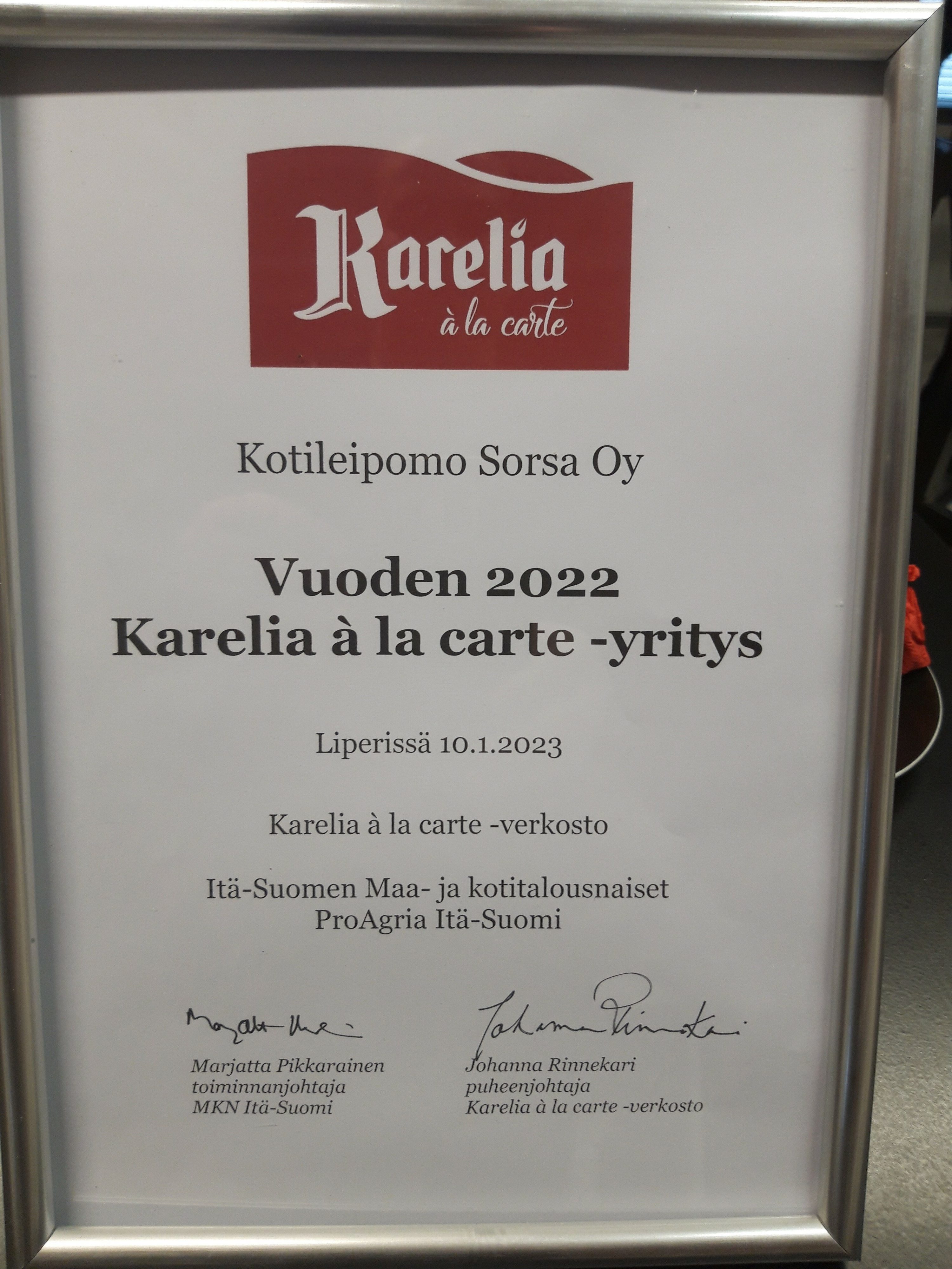 Kotileipomo Sorsa Oy on valittu vuoden 2022 Karelia à la carte -yritykseksi. Kotileipomo Sorsa valmistaa perinteisiä karjalanpiirakoita ja sultsinoita sekä yrityksen itse tuotekehittämiä poropiirakoita. Karjalanpiirakat valmistetaan edelleen perinteitä vaalien käsin rypyttämällä. Tuotteita on saatavilla sekä tuoreena että raakapakasteena.