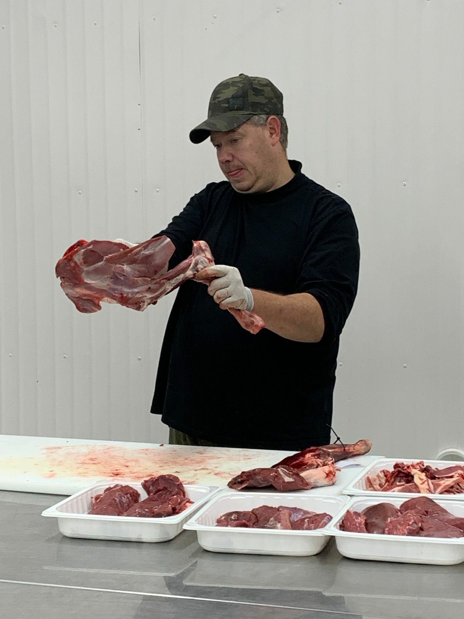 Kun jakauduimme kahteen ryhmään, päästiin suoraan asiaan. Toni Lintula johdatti ensimmäisen ryhmän peuran nylkemisen saloihin. Hän avasi yksityiskohtaisesti, mitä kaikkea tapahtuu jo ennen kuin eläintä voidaan alkaa paloittelemaan: miten peura tuodaan metsästä, mitä tarkastuksia ja esivalmisteluja tehdään ja millainen on oikeaoppinen työskentelytapa lahtivajalla. Moni osallistuja kertoi jälkikäteen yllättyneensä siitä, kuinka järjestelmällistä ja siistiä työ on.