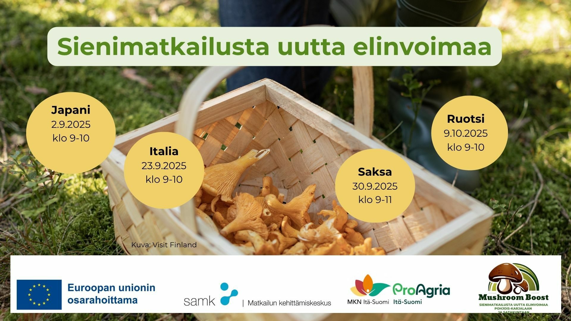 Webinaarit järjestää Mushroom Boost – Sienimatkailusta uutta elinvoimaa Pohjois-Karjalaan ja Satakuntaan kehittämishanke (1.1.2025 – 31.12.2026), jota rahoittaa Euroopan maaseuturahasto 2023–2027.